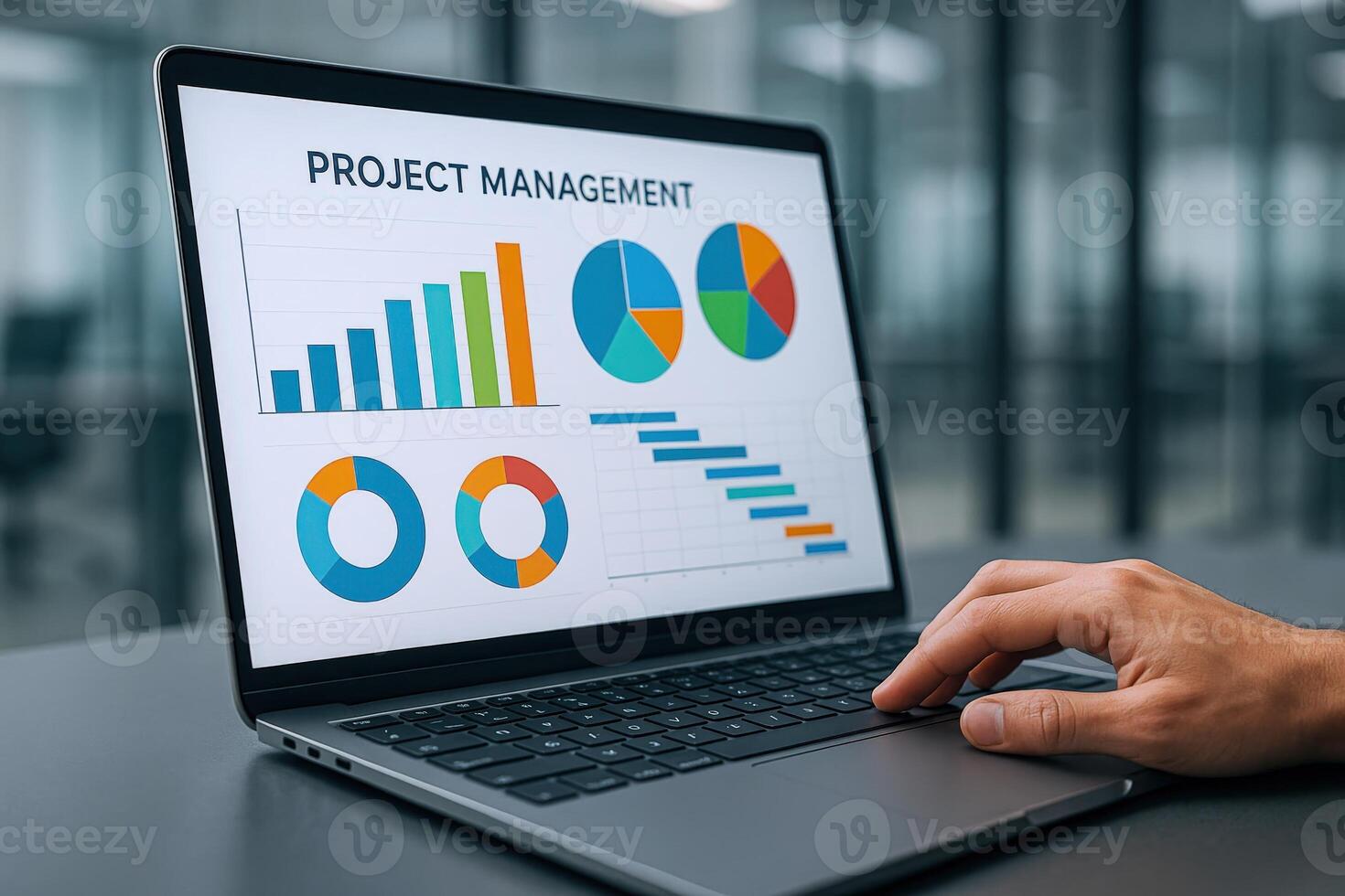 Laptop Displaying Project Management Data Charts, Graphs, and Information, Highlighting Progress and Business Analytics Analysis Pro Photo