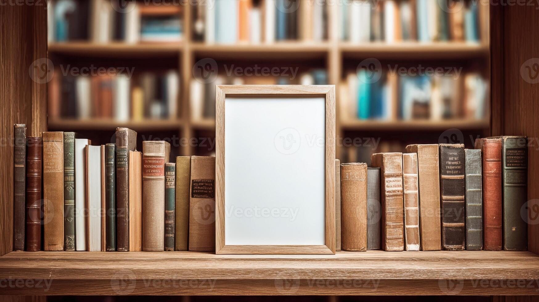 Elegant Frame Mockup on Bookshelf Display, Perfect for Art, Photos, and Announcements in Library Setting Pro Photo