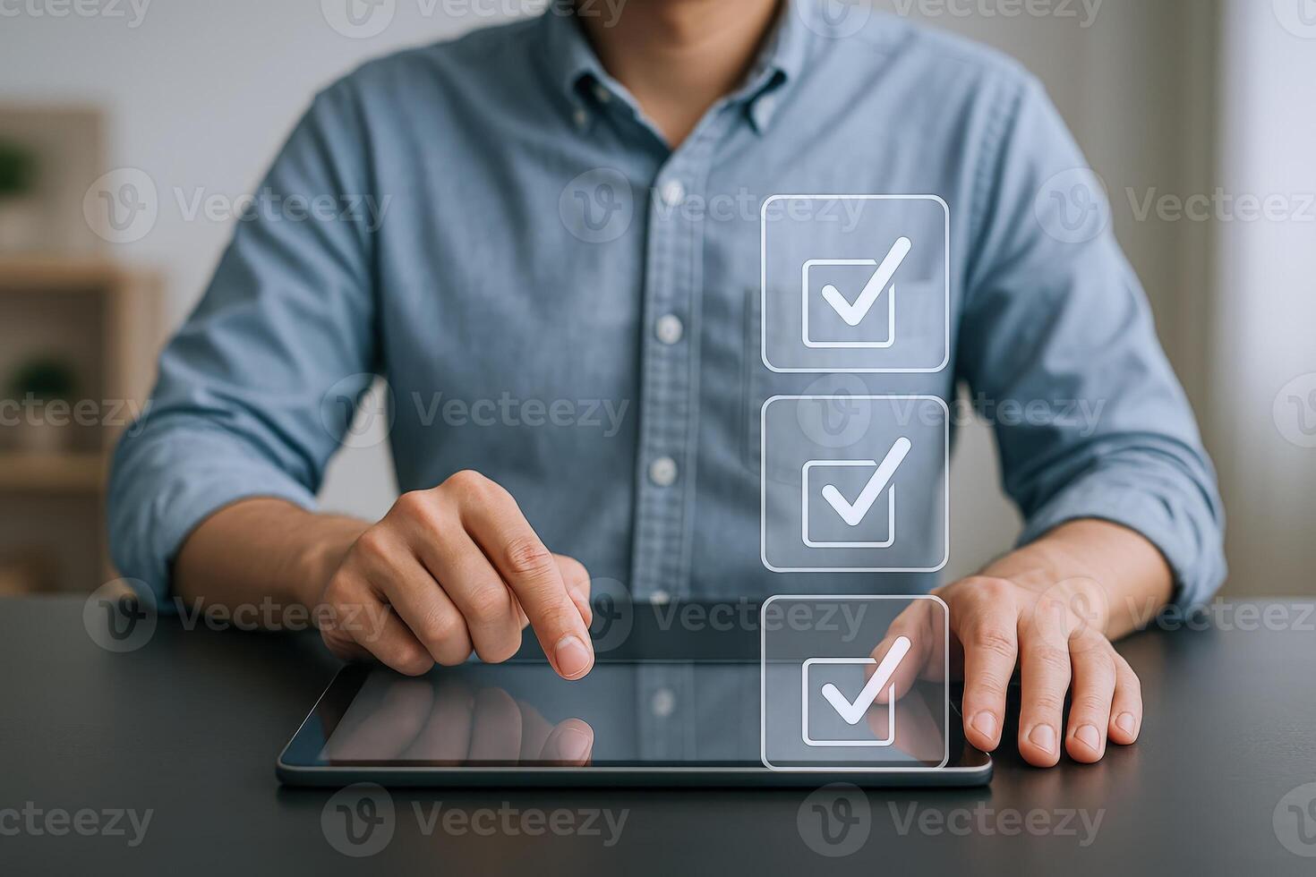 Man Using Digital Tablet with Checkmarks Displayed for Task Completion and Approval Concept Pro Photo