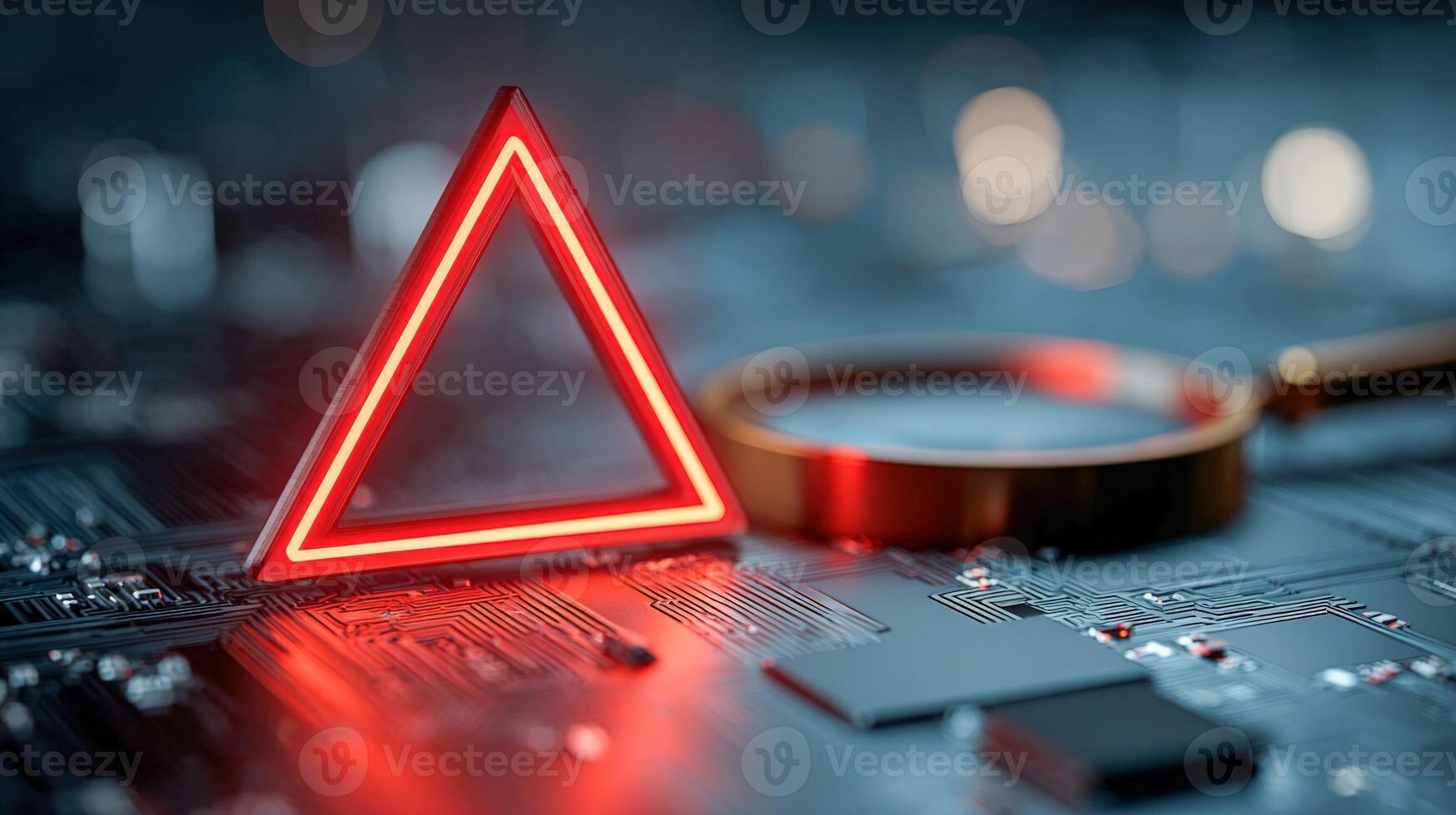 Red Triangle Alert on Circuit Board with Magnifying Glass Cyber Security Concept Pro Photo