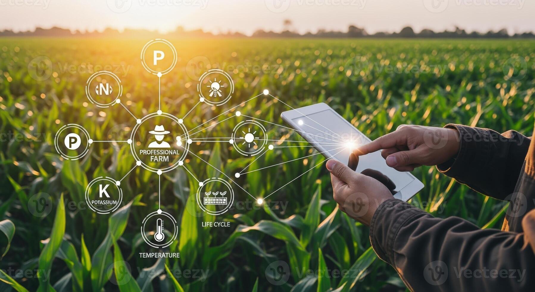 Precision Agriculture Farmer Using Tablet Technology in Cornfield for Data Analysis and Crop Management Pro Photo