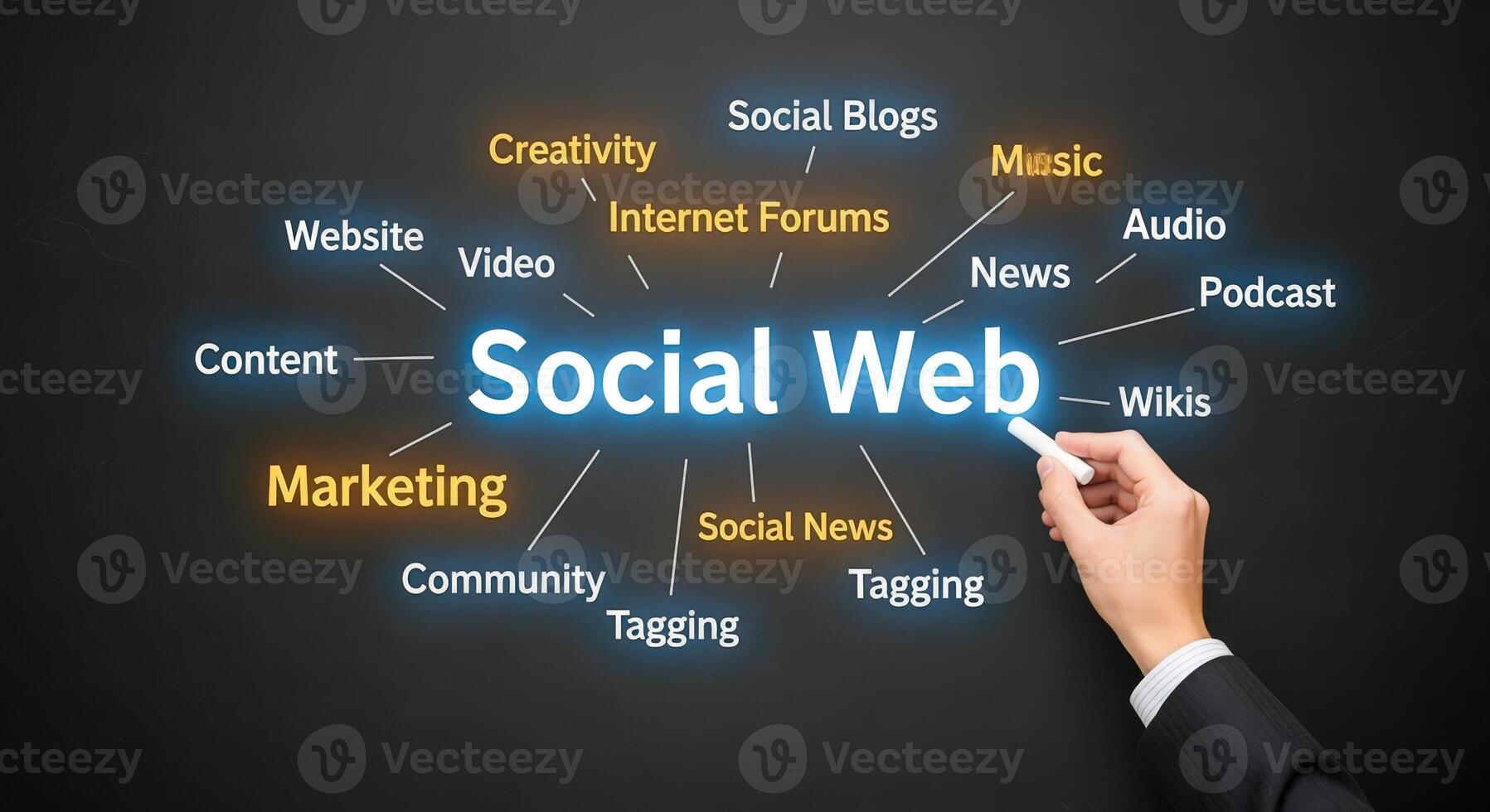 Social Web Concept Diagram with Hand Drawing Components on Black, Featuring Content, Community, Marketing, and Internet Forums Pro Photo