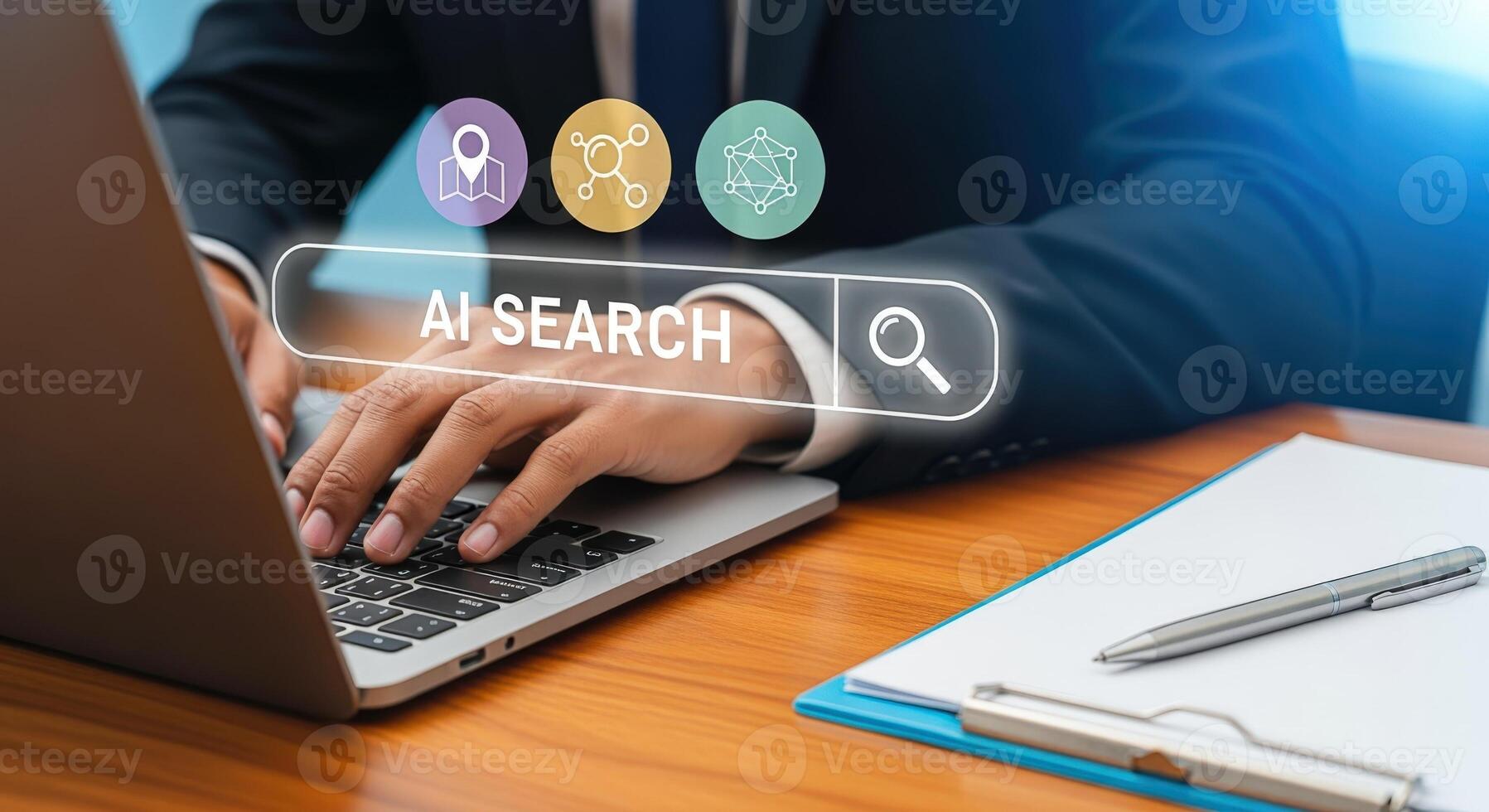 AI Search Concept Businessman Using Laptop with AI Search Bar and Icons on Screen Pro Photo