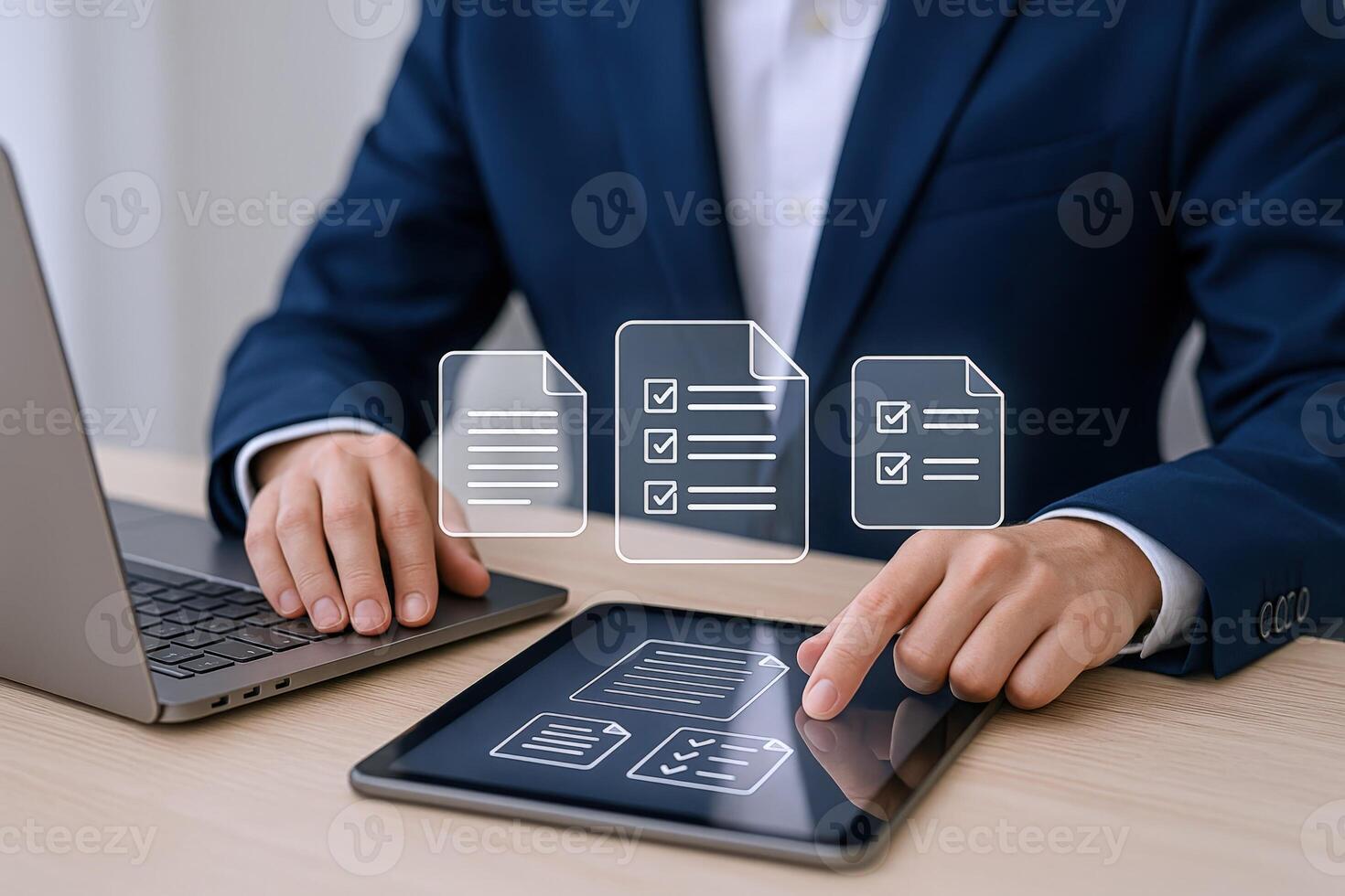 Businessman interacting with digital documents on a tablet, streamlining workflow in an office setting Pro Photo