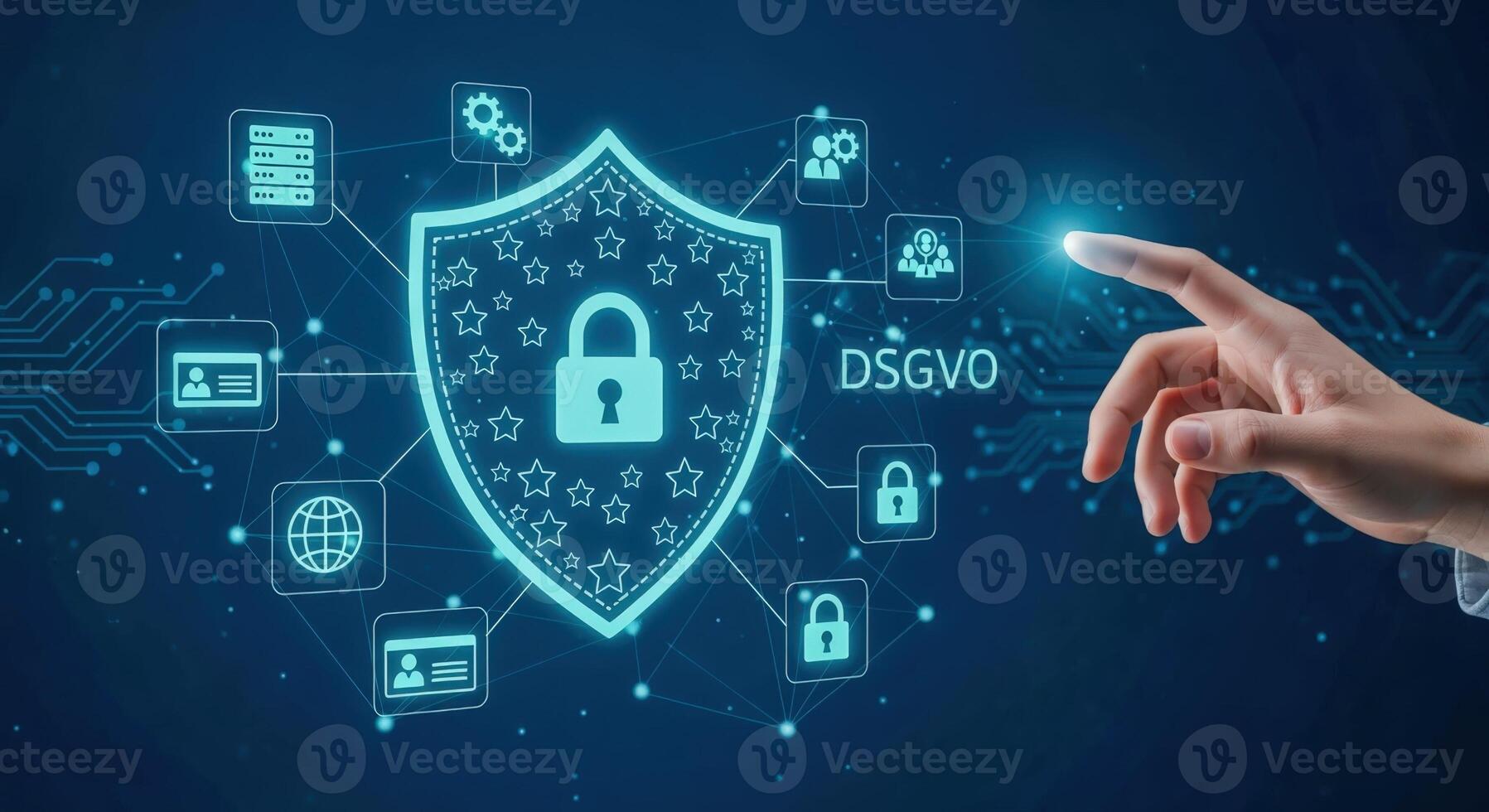Data Protection and Cybersecurity Shield with Lock Symbolizing DSGVO Compliance, Hand Interacting with Interface Pro Photo