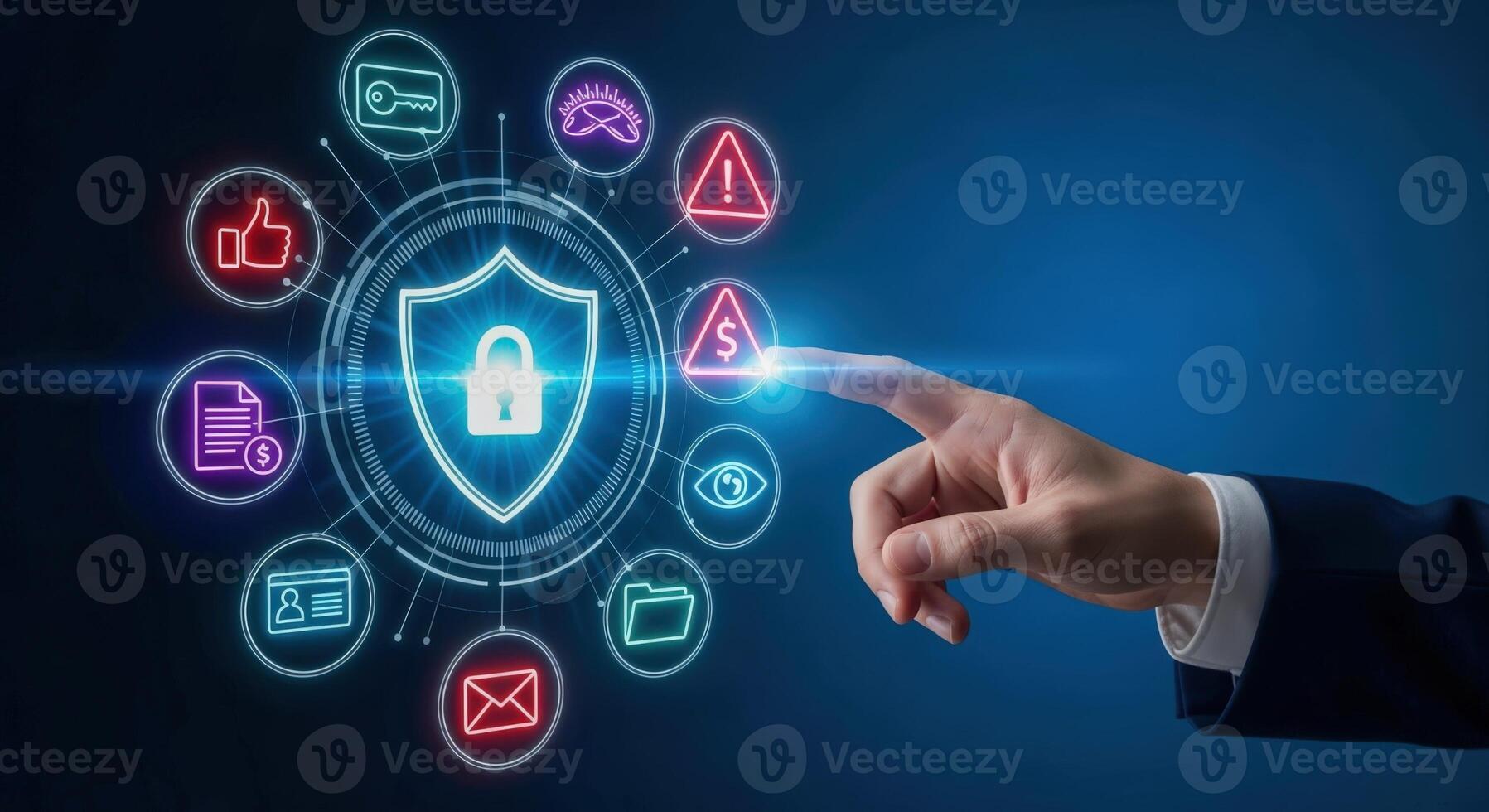 Cybersecurity Concept Man Touches Holographic Shield with Padlock Symbolizing Data Protection, Internet Security and Network Defense Pro Photo