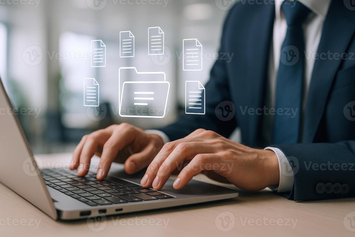 Businessman managing digital documents on a laptop, representing data management and workflow efficiency in the modern workplace Pro Photo
