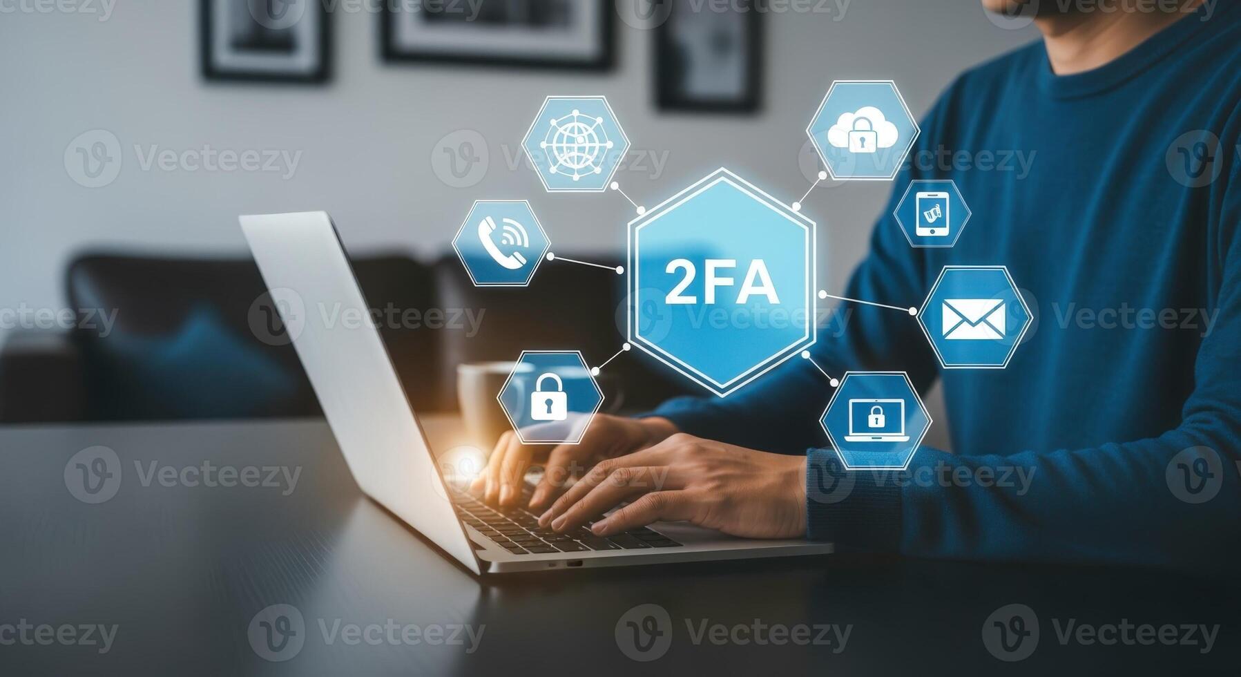 Two-Factor Authentication Man Using Laptop with 2FA Security Icons for Data Protection Pro Photo