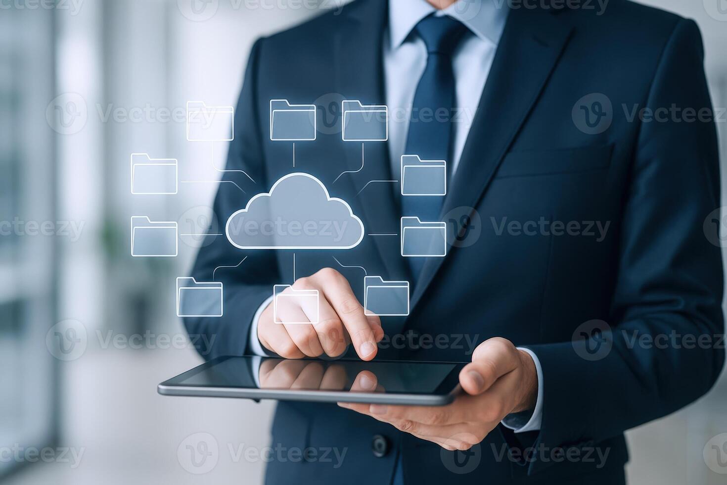 Cloud Computing Data Storage System Businessman Accessing Digital Information via Tablet for Network Management Pro Photo