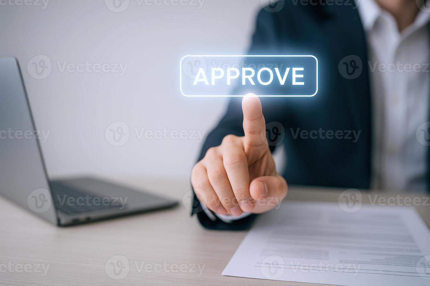 Businessman pressing virtual approve button on holographic interface representing agreement and authorization with laptop and document Pro Photo