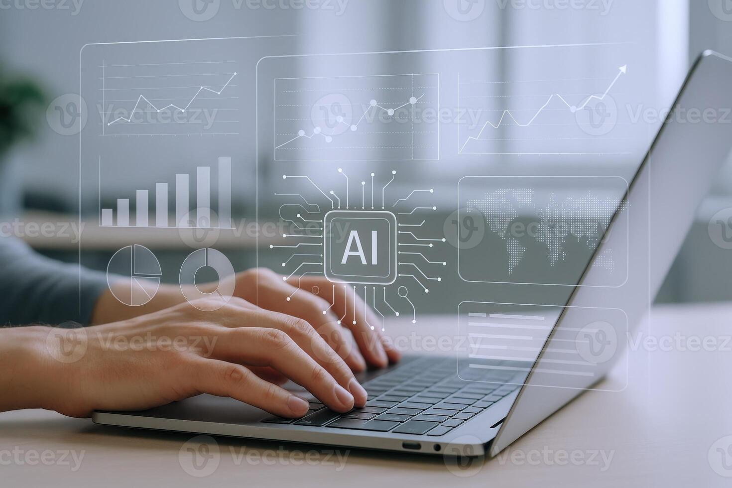 AI Integration Concept Close-up of Hands Typing on Laptop with Artificial Intelligence Overlay Pro Photo