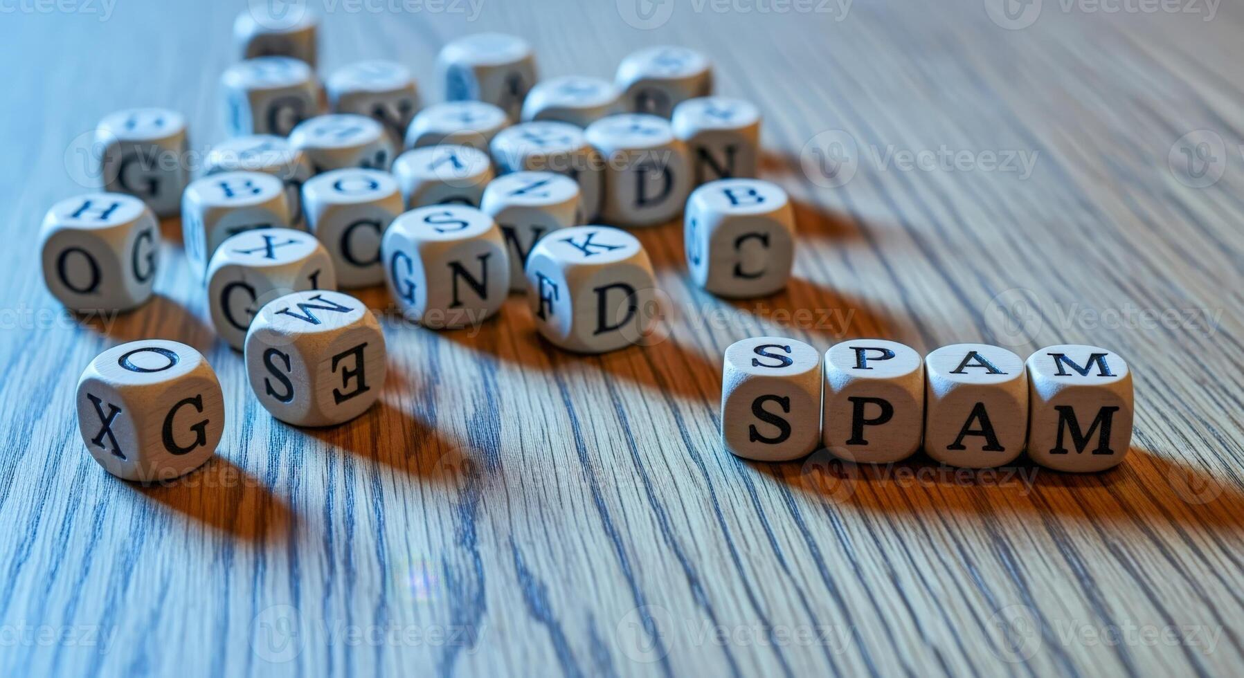 Cubes spelling out SPAM and some random letters Scam or junk concept with copy space Pro Photo