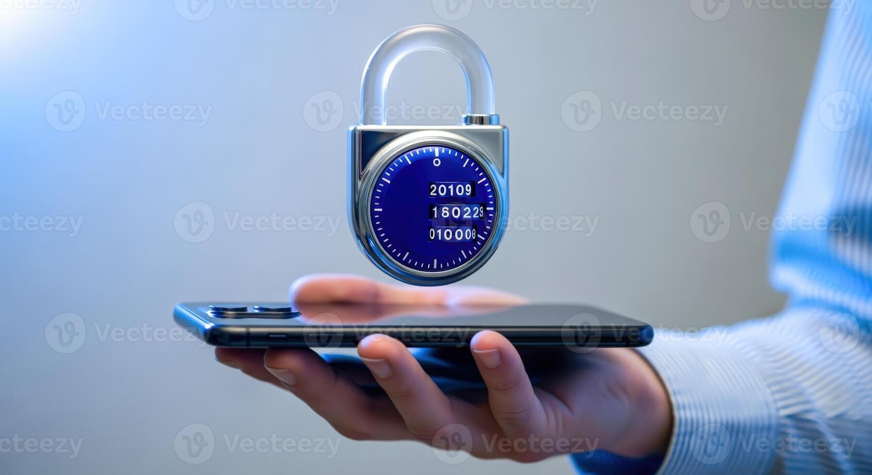 Smartphone Security Concept A Person Holding a Phone with a Floating Digital Combination Lock Pro Photo