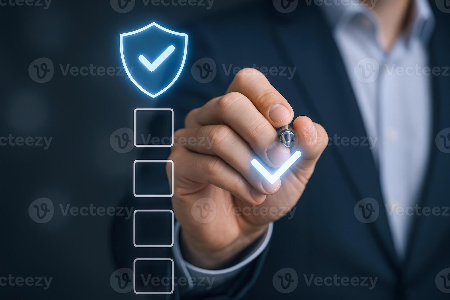 Businessman completing a digital checklist with security shield, illustrating data protection and compliance in a modern business setting Pro Photo