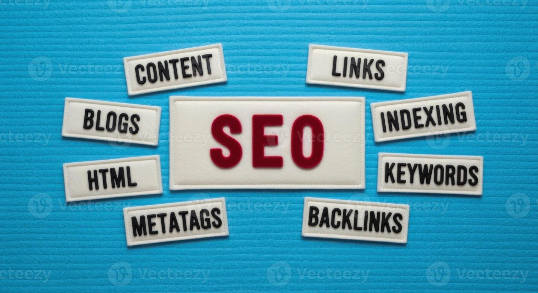 Conceptual SEO Optimization for Website Ranking Keywords, Links, Content, and Indexing on Blue Background Pro Photo