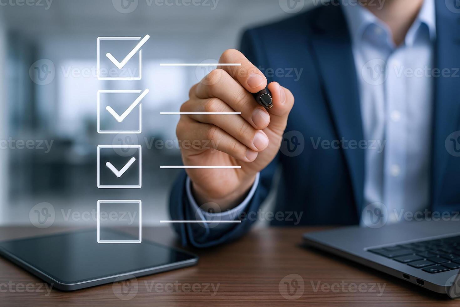 Businessman Marking Checklist Boxes on Digital Screen with Stylus, Representing Task Completion and Approval Pro Photo