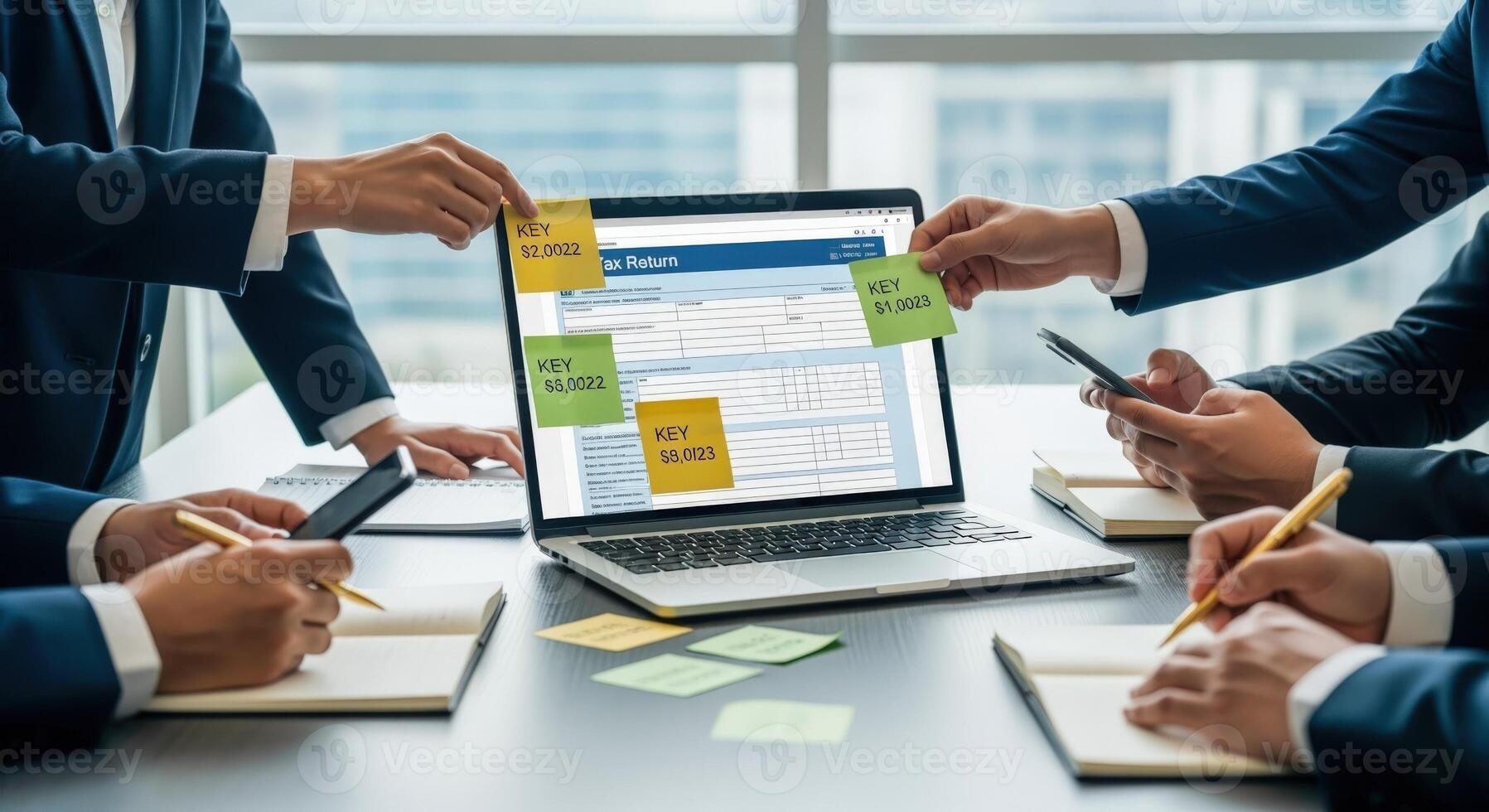 Business Team Analyzing Data on Laptop Screen with Sticky Notes for Collaboration and Planning Pro Photo