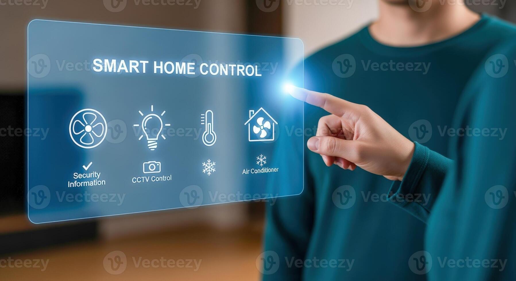 Smart Home Automation Man Interacting with Touchscreen Control Interface to Manage Household Systems Pro Photo