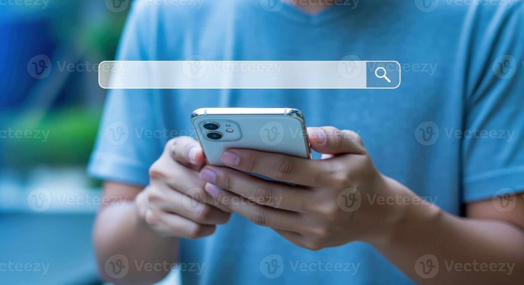 Man Holds Smartphone with Search Bar Overlay, Concept for Online Information and Web Browsing Pro Photo