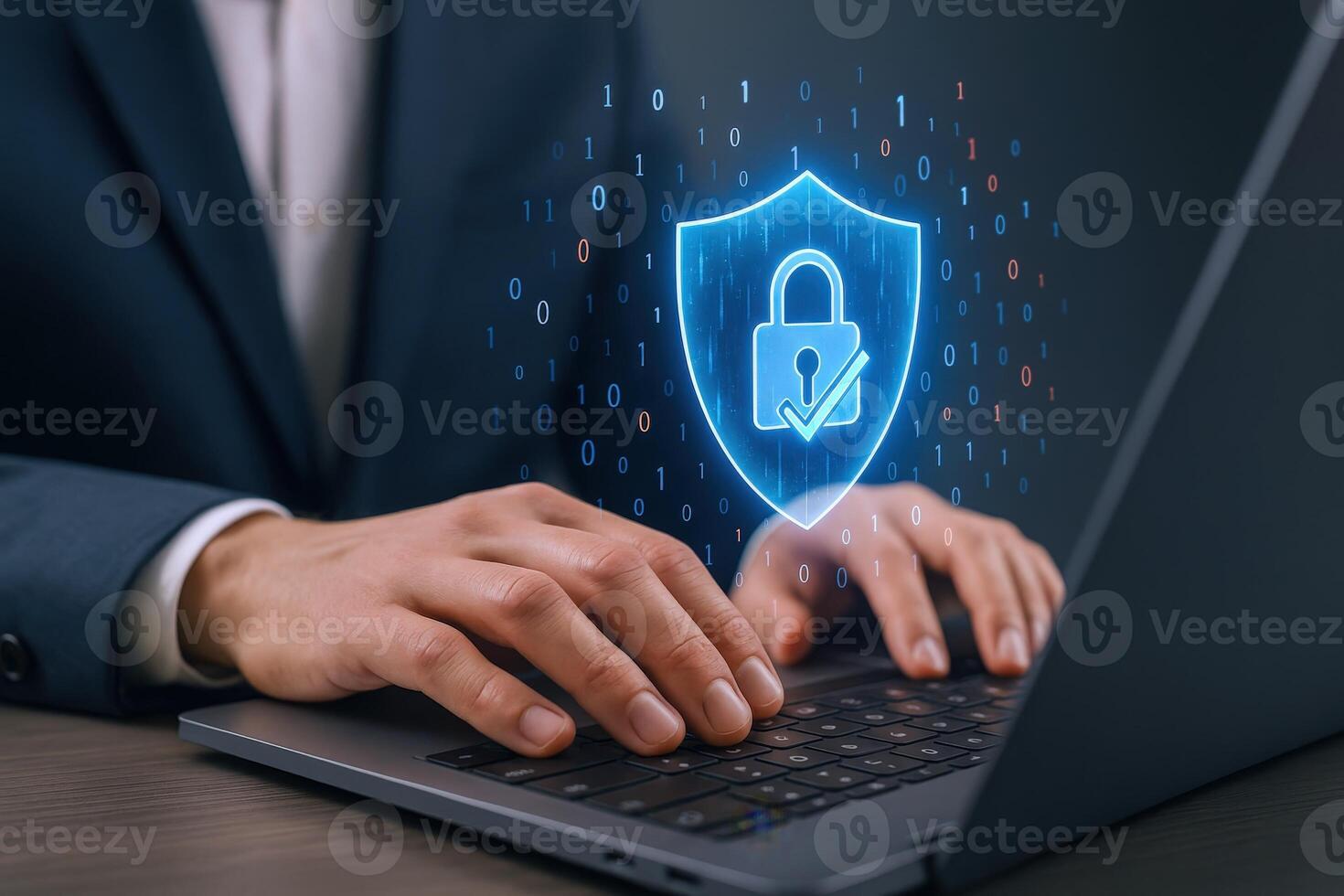 Data Security Concept Businessman Using Laptop with Digital Shield and Lock Icon Overlay for Cyber Protection Pro Photo