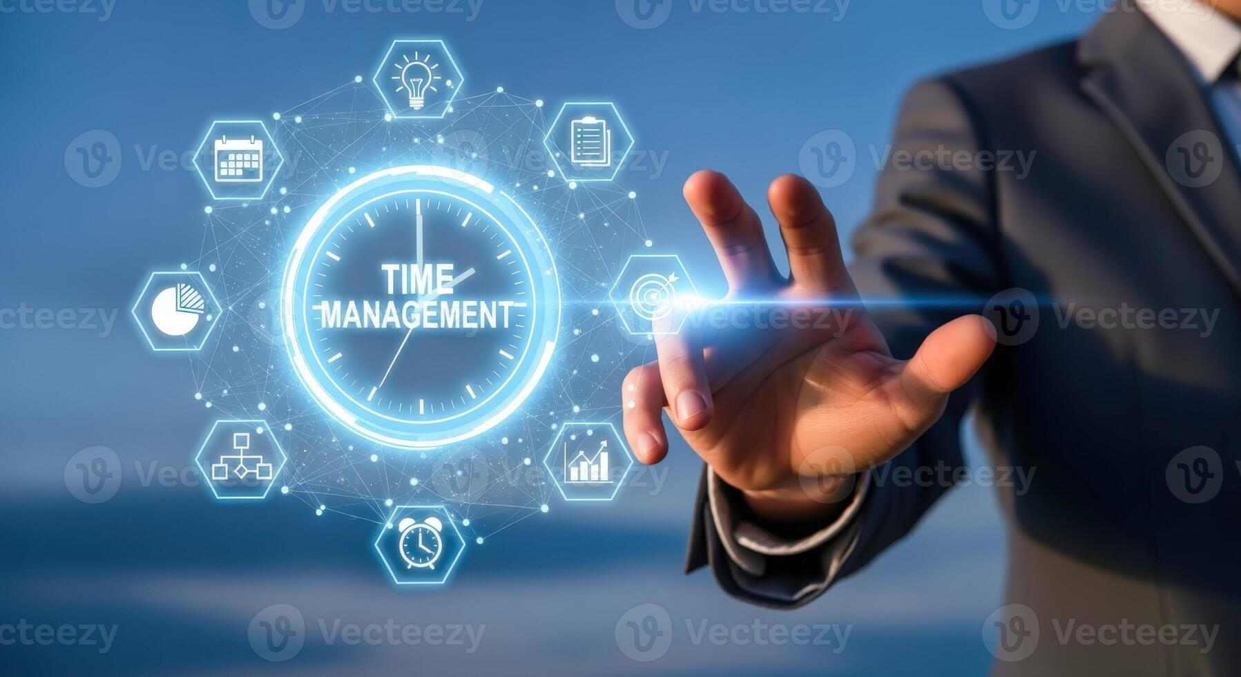 Businessman Activating Time Management Interface Optimizing Productivity and Efficiency for Business Success in Digital Era Pro Photo