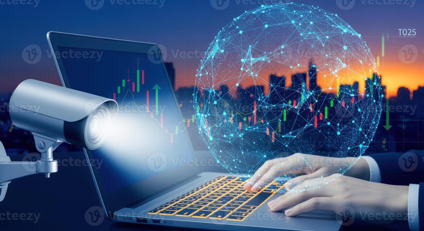 Security Camera Monitoring Data on Laptop Screen with Cityscape and Global Network Overlay Pro Photo
