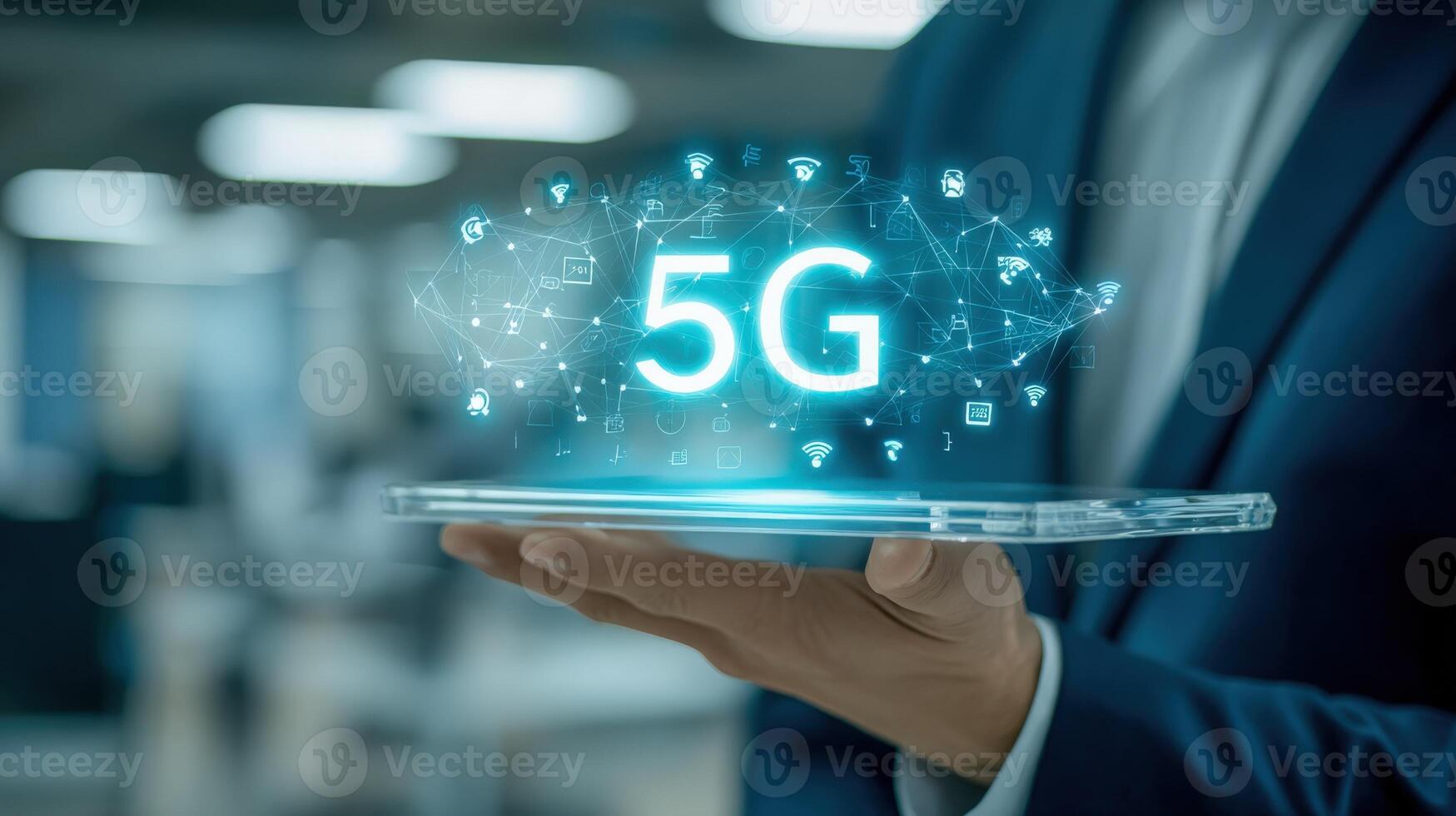 5G Technology Displayed on Tablet Held by Businessman, Connecting Digital Network and Communication for Future Pro Photo