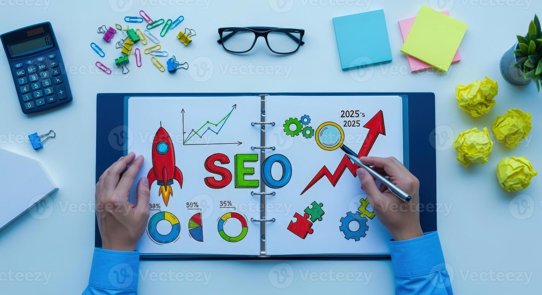 SEO Strategy Planning Hands Illustrating Search Engine Optimization Concepts, Analytics, and Growth on Open Notebook Pro Photo