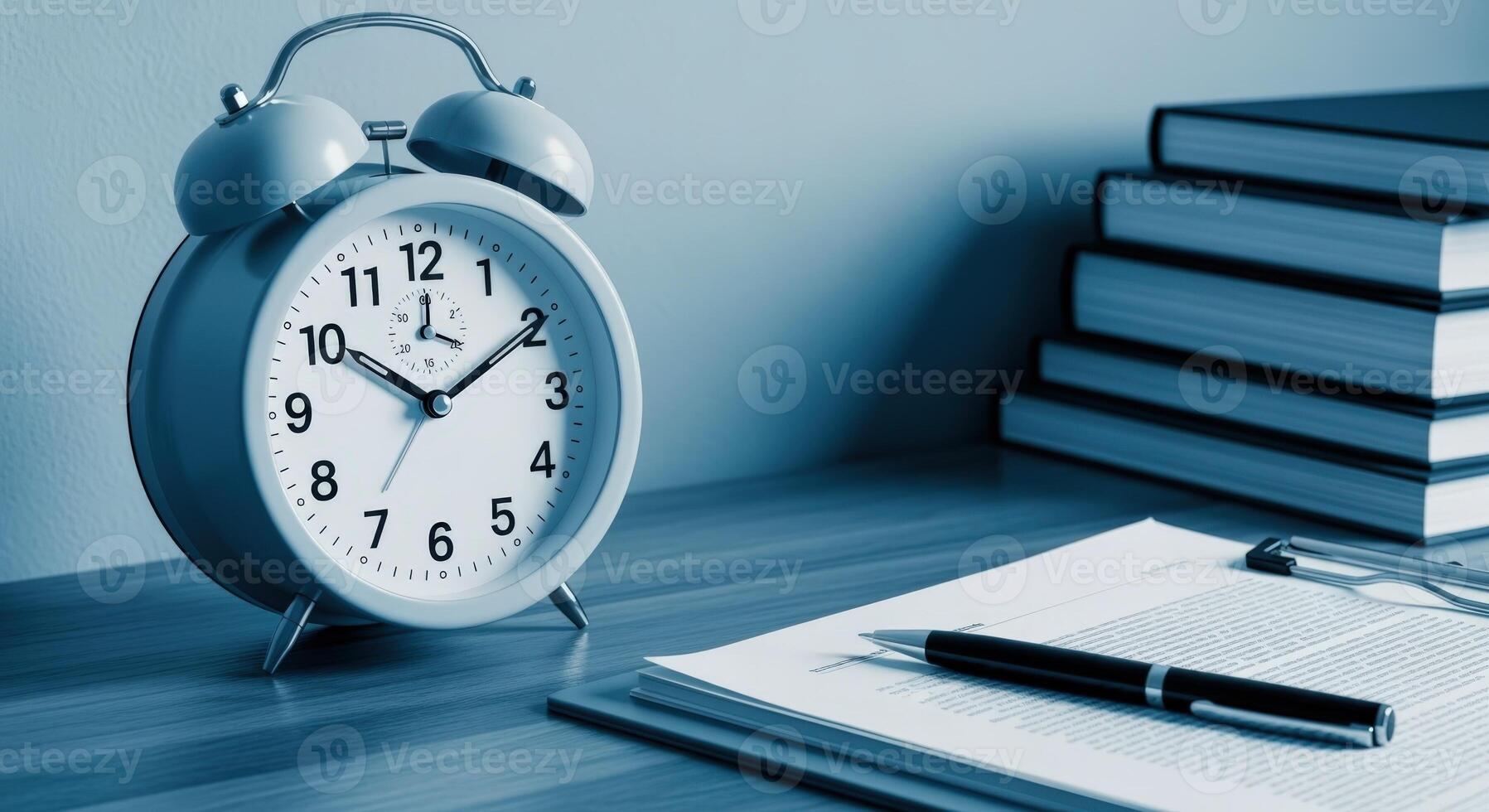 Time Management Concept Alarm Clock, Books, Pen, and Documents on a Desk, Emphasizing Productivity Pro Photo