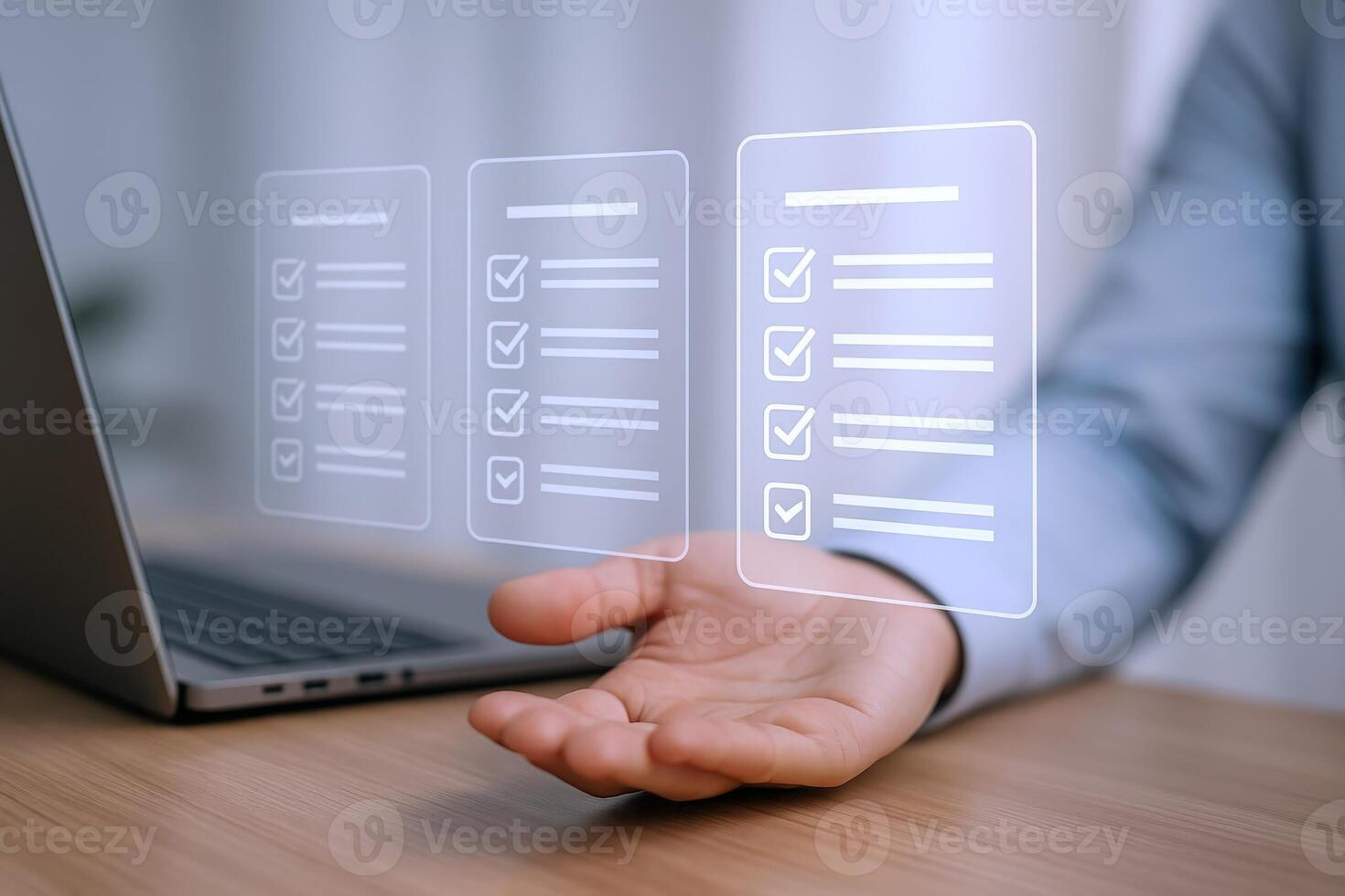 Digital Checklist on Hand Man Using Laptop for Online Survey and Form Completion Pro Photo