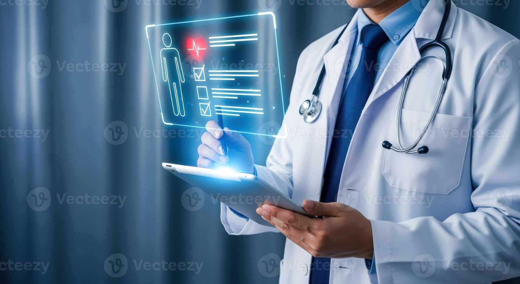 Doctor Using Digital Tablet Examining Patient Data with Futuristic Technology Interface in Hospital Setting Pro Photo
