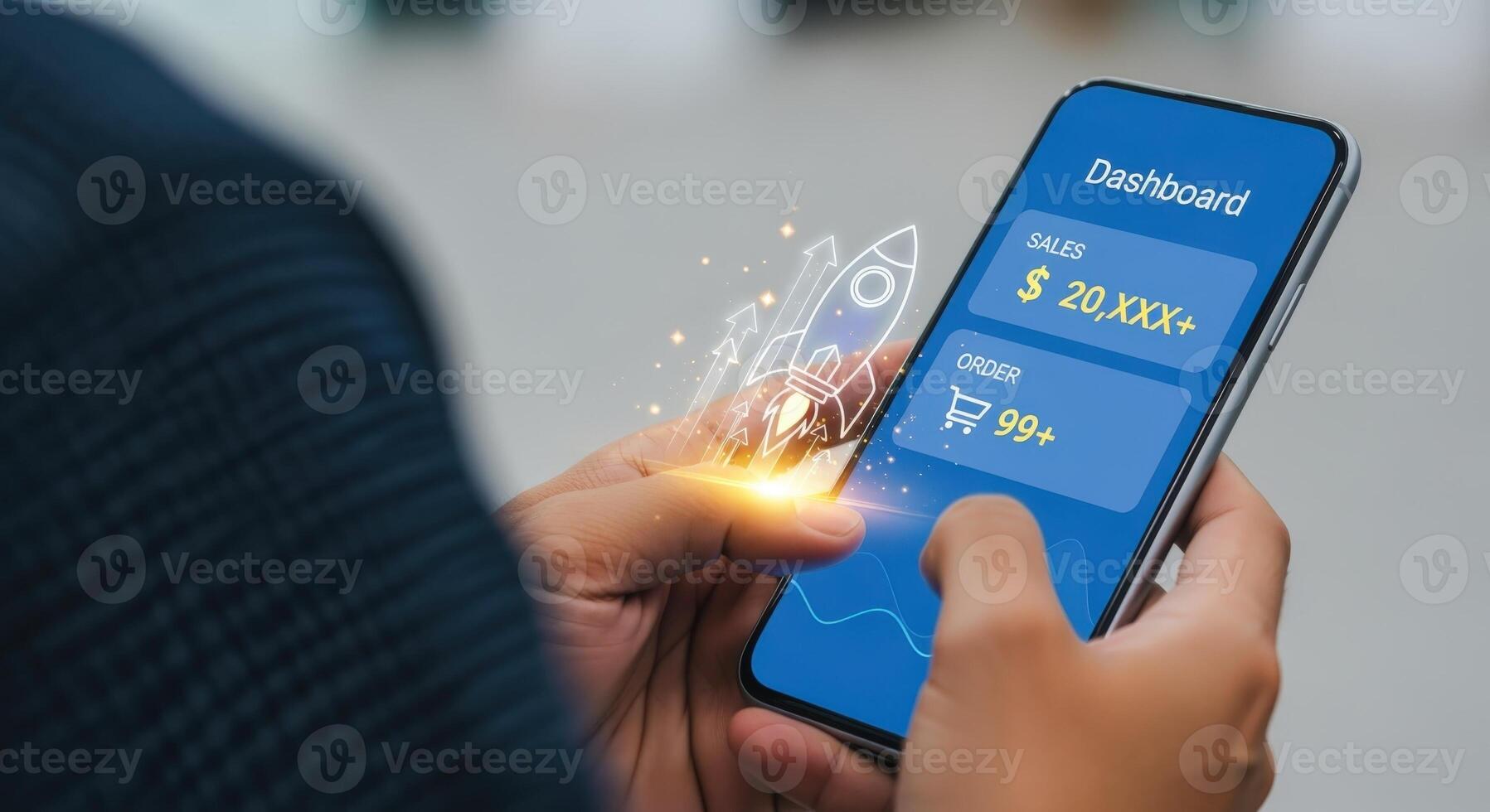 Hands Holding Smartphone Displaying Business Dashboard with Rocket Launch Graphic, Representing Growth and Success Pro Photo