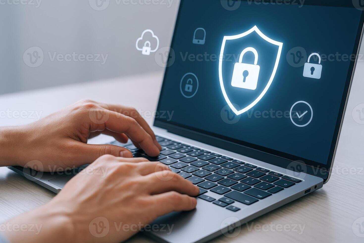 Cybersecurity Protection Man Typing on Laptop with Digital Security Shield Display, Data Protection Concept Pro Photo