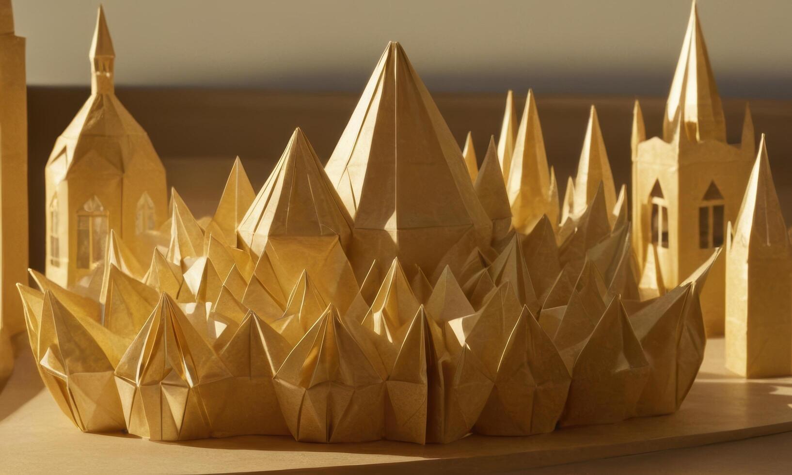 Paper structures create a whimsical landscape with intricate peaks and buildings photo
