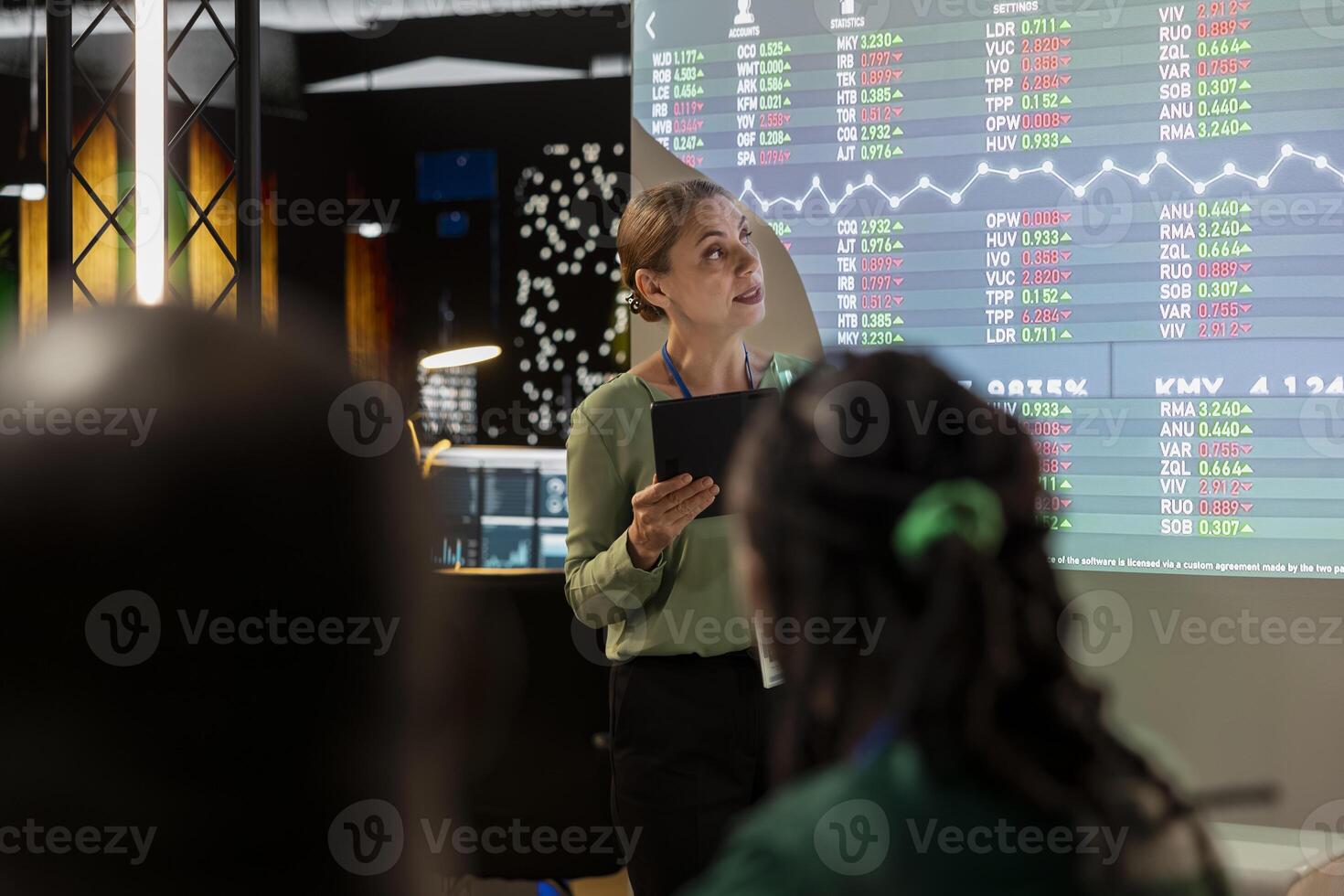 Business associates examining key performance indicators within the enterprise activity. Conducting evaluations and discuss updates to foster professional development, team efficiency. Pro Photo