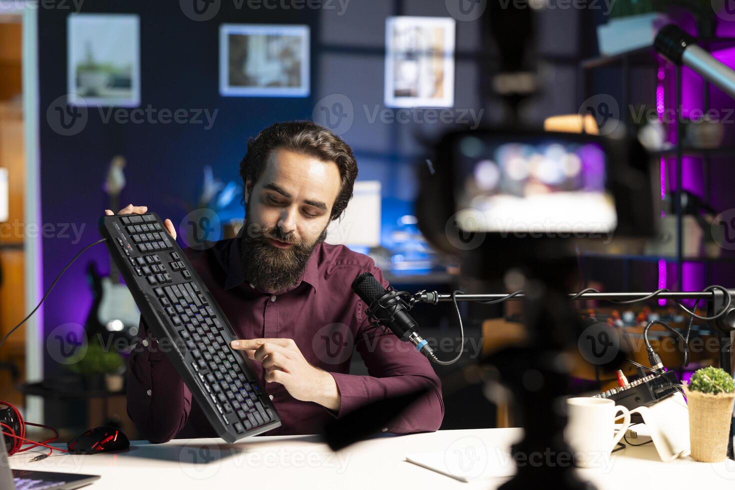 Influencer filming keyboard review in apartment, showing typing capabilities. Technology guru showcasing computer peripheral to audience on niche online channel, looking at functionalities Pro Photo
