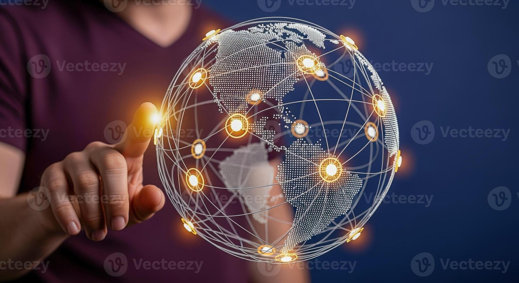 Global Network Connection A Person Touching a Digital Globe Representing Connectivity, Communication, and Technological Advancement Pro Photo