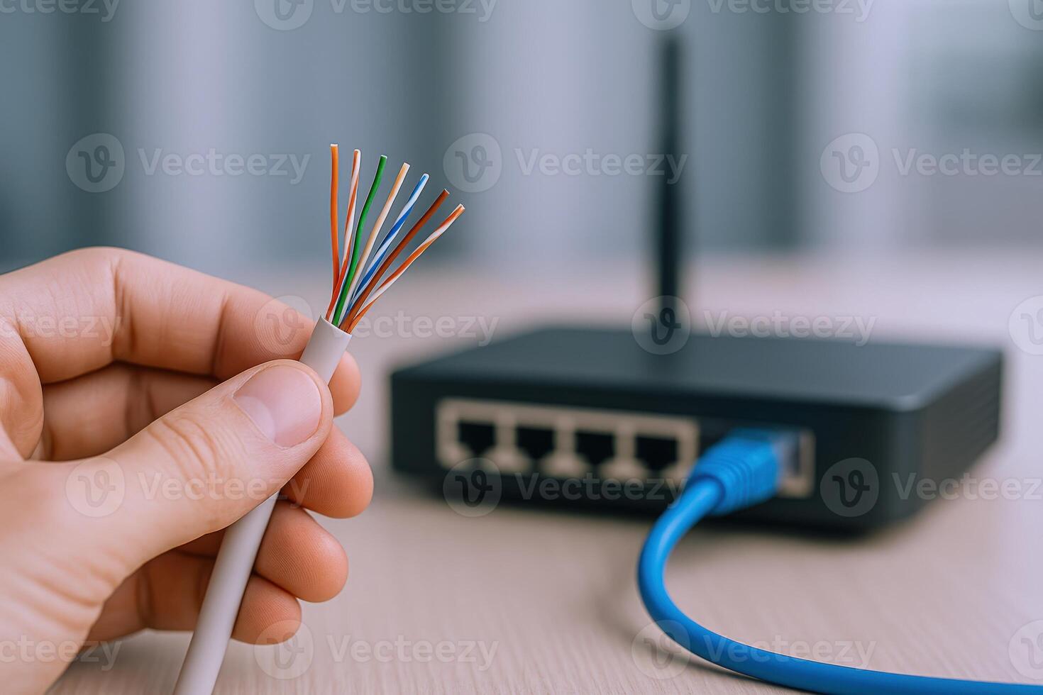 Connecting a Network Router with Ethernet Cable, Showing Cable Wires, Internet Connectivity, and Data Transfer Pro Photo