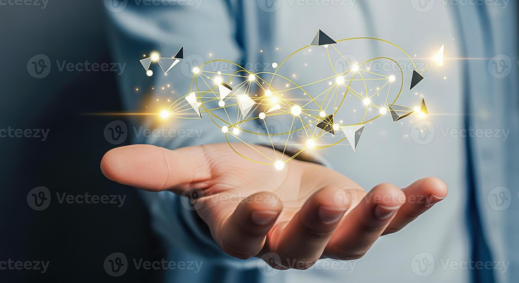 Data Network Connection A Conceptual Image of a Man Holding a Glowing, Abstract Network Structure Pro Photo