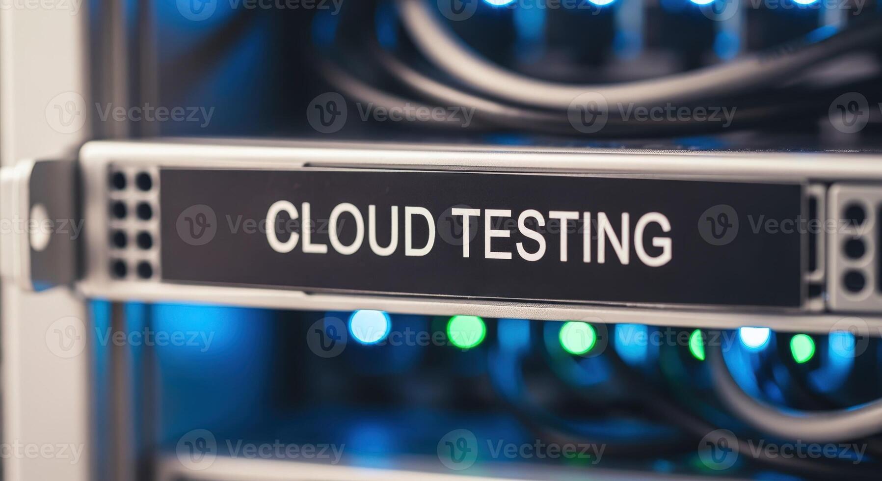 Server rack with cloud testing label illustrates internet security and infrastructure in a data center Pro Photo