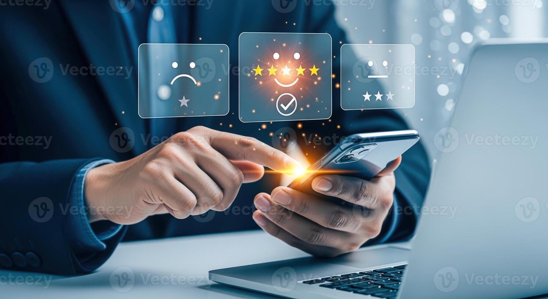 Customer feedback via smartphone concept showcasing satisfaction, ratings, and user experience in digital interface Pro Photo