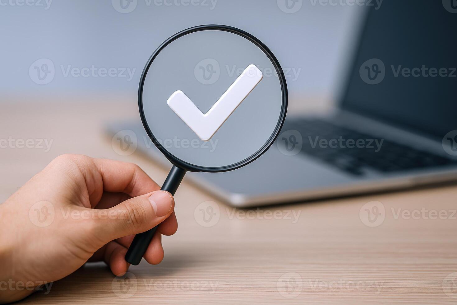 Magnifying Glass Over Checkmark Shows Approval, Completion, and Agreement, with Laptop Computer in Background Pro Photo