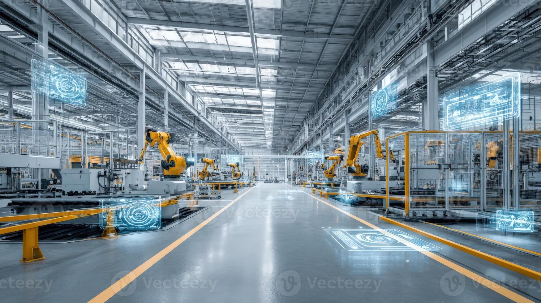 Robotic Automation in Modern Factory Futuristic Production Line with Digital Displays and Advanced Machinery Pro Photo