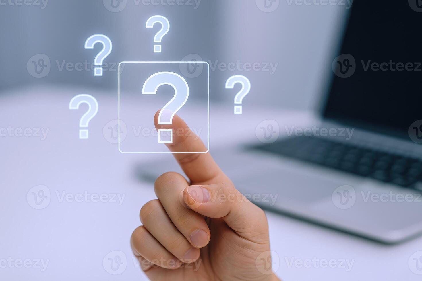 Interactive Digital Interface Featuring a Question Mark Pressed by a Hand with Laptop in Background Pro Photo