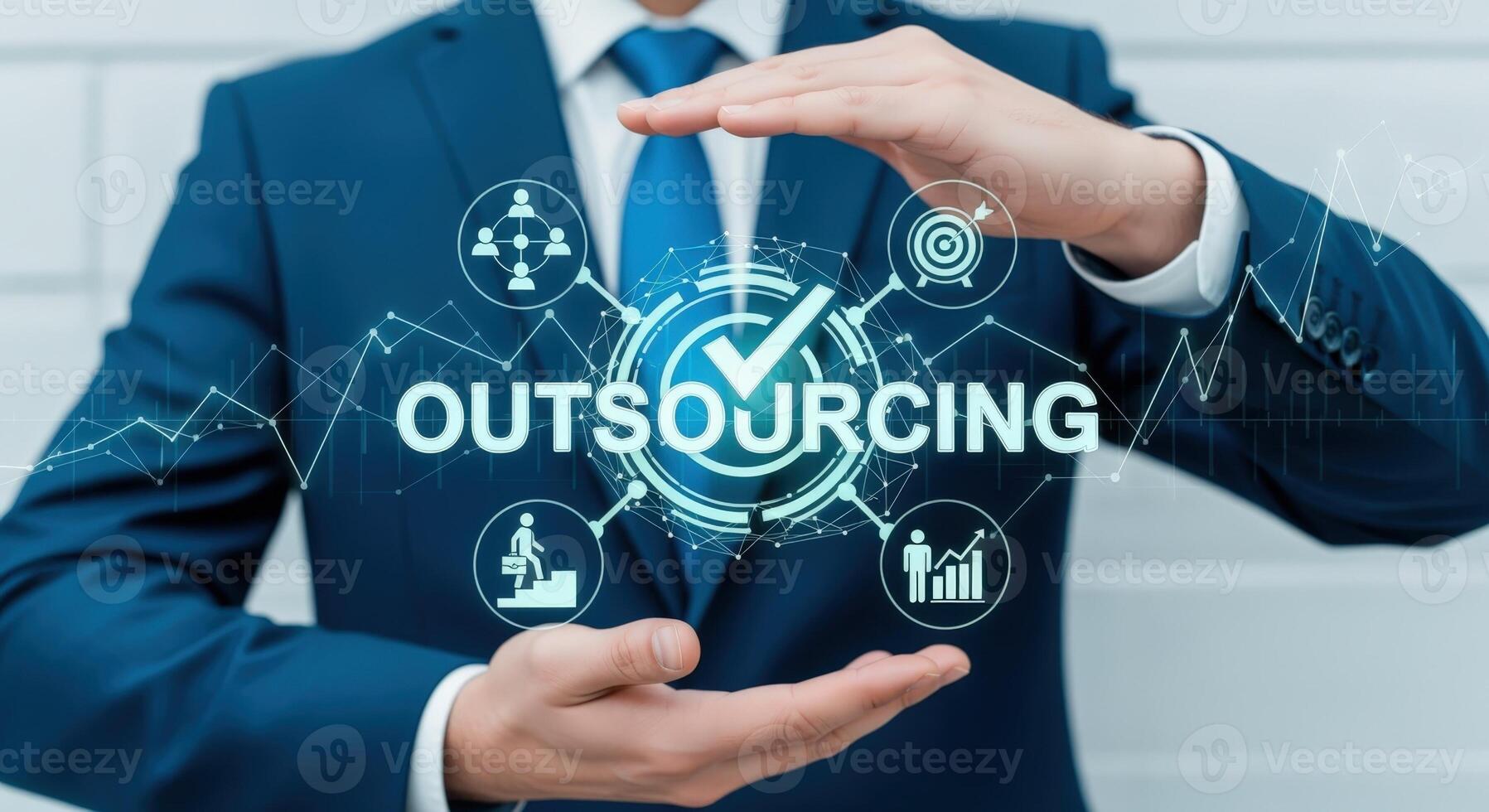 Business Professional Visualizing Outsourcing Solutions with Digital Interface, Data, and Strategy for Company Growth Pro Photo