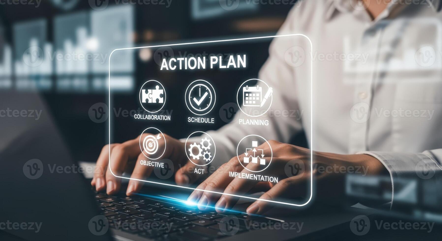 Business Professional Creating an Action Plan Using a Virtual Interface, Optimizing Strategy and Team Collaboration for Project Success Pro Photo