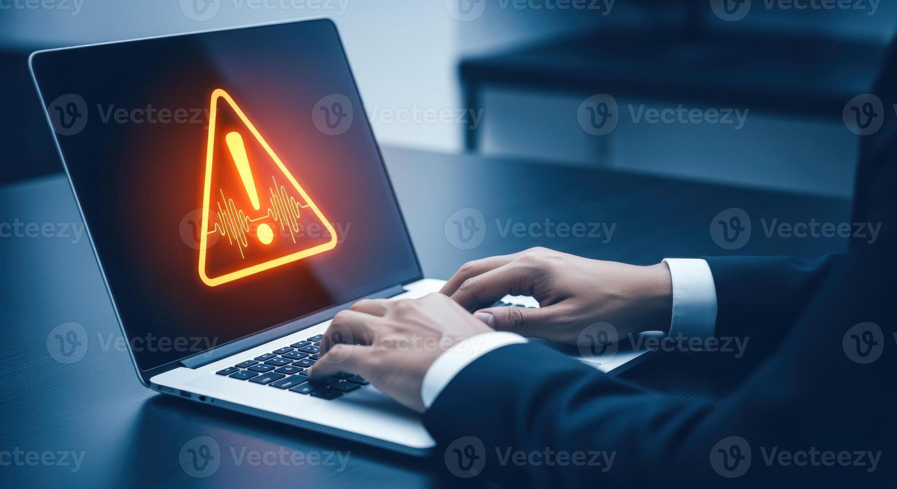 Cybersecurity Alert Man Typing on Laptop Displaying Warning Sign, Highlighting Digital Security Risks and Vulnerability Pro Photo