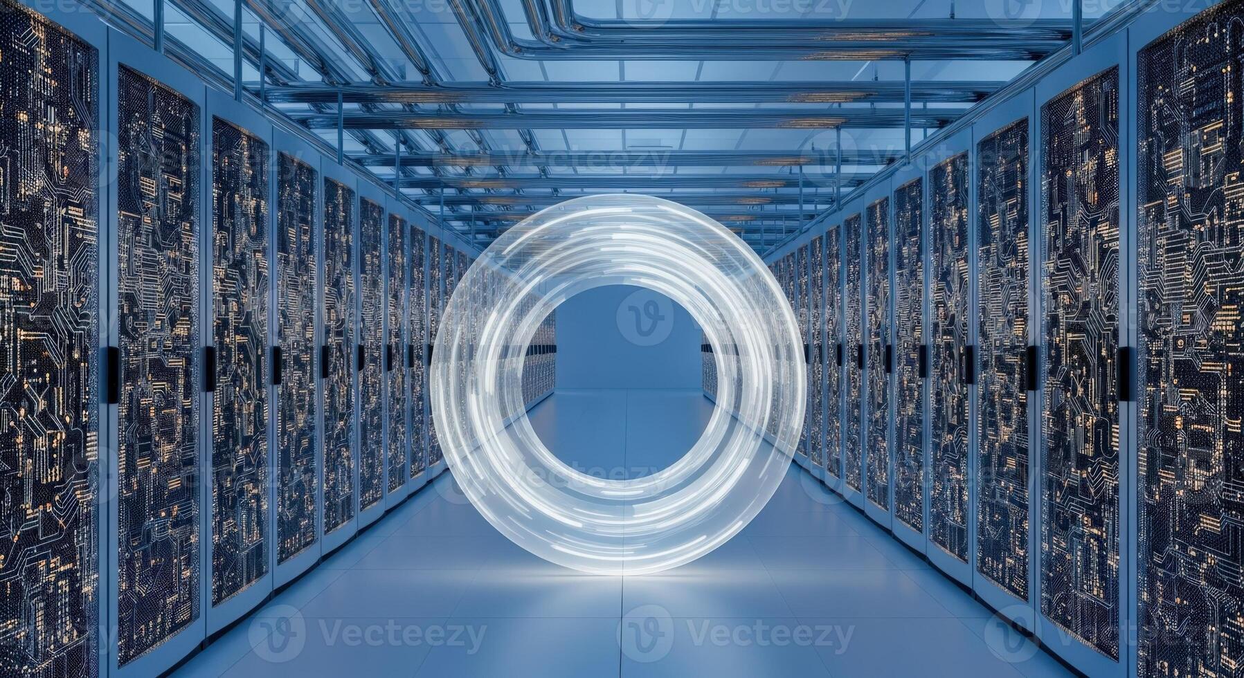 Futuristic Data Center with Glowing Portal High-Tech Server Room for Cloud Computing and Data Storage Pro Photo