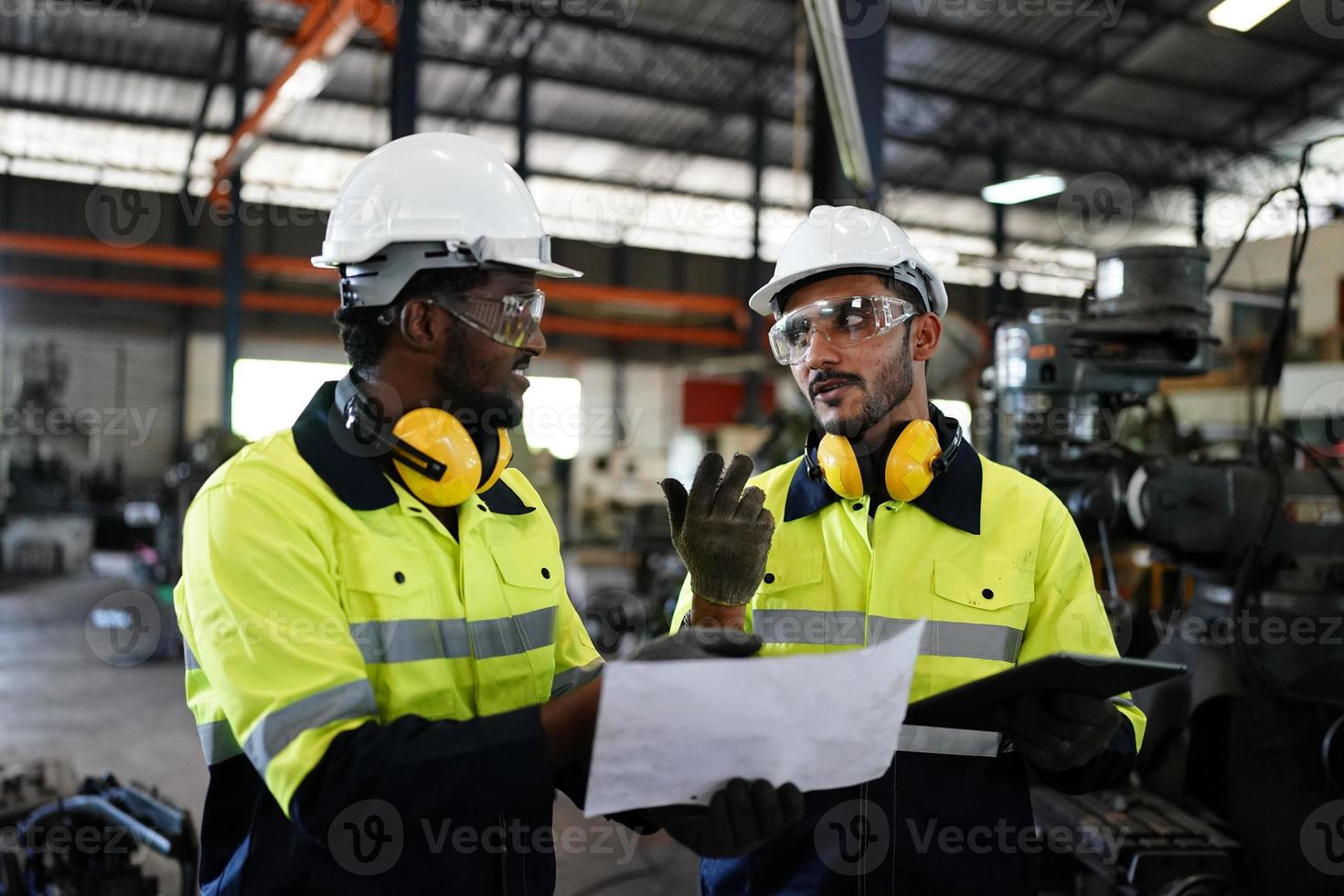Maintenance Engineers is working in front of the automated CNC machinery repair on a maintenance checklist at the production line. Pro Photo