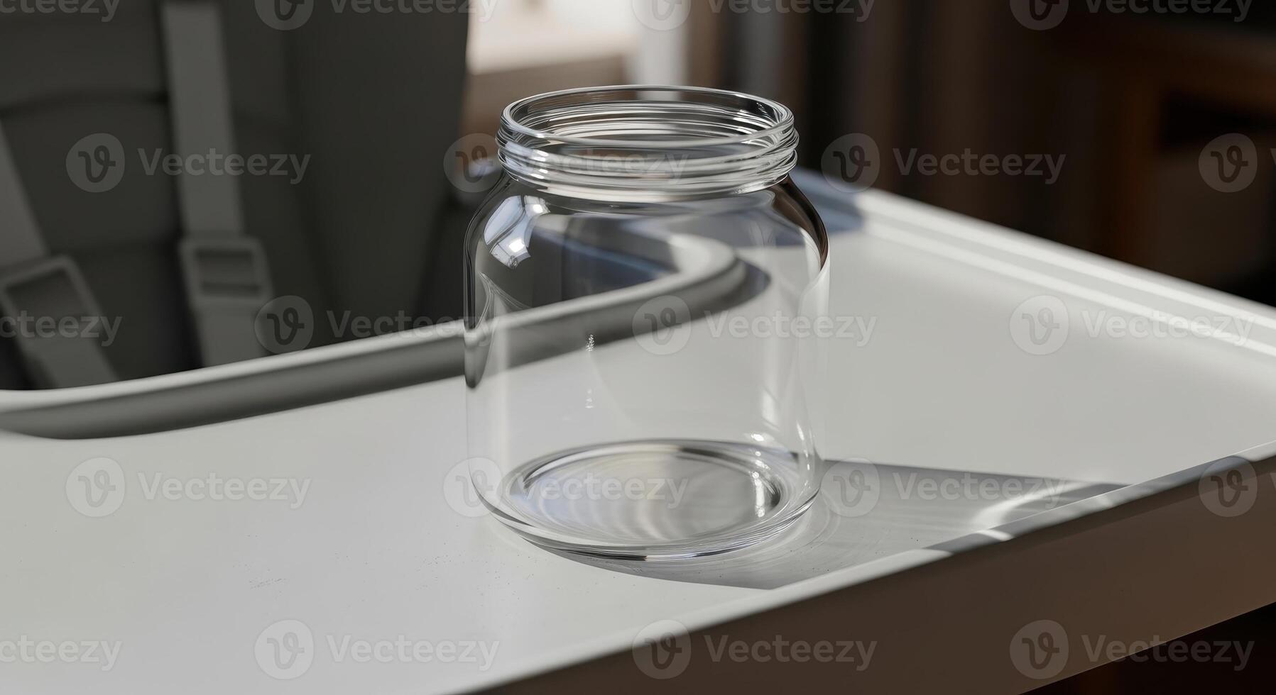 Empty glass jar on a table with natural light, showcasing a clean and simple design Pro Photo